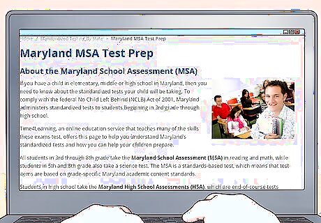 Do practice questions and tests with your child, if possible. Practice tests are often designed to prepare students for the types of questions they’ll encounter on standardized tests. Use practice questions to help your child prepare for the MSAs and take practice tests, if possible. Practice questions for the MSAs can be found on the Maryland School Performance website. While the state government doesn’t provide full practice tests for the MSAs, you might consider using practice PSATs to help your child get used to the typical format of standardized tests.