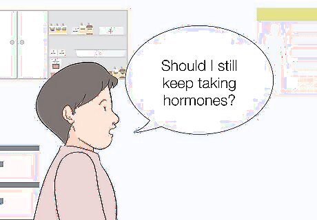 Ask your doctor if you should keep taking hormones up to your surgery. If you're taking hormones to help affirm your gender identity, talk to your doctor about whether or not it's safe to take them up to your surgery day. Their advice can vary based on their experience and the type of hormones you're taking. Discuss your needs and preferences with them before you go in for surgery. If you're taking estrogen, your doctor will likely recommend you continue taking it because it helps improve your surgery results. Estrogen supports breast tissue growth, so it will help improve the shape of your breasts post-surgery. Taking testosterone can reduce dysphoria, and it may improve surgery results if you desire more masculine secondary sex characteristics. However, it's best to consult with licensed medical and mental health professionals before going on testosterone. If you experience low energy or mood swings while off of your hormones, tell your doctor this before you agree to stop taking them.Tip: You don’t need to be on hormones to get top surgery. Just tell your doctor that you’re not currently taking hormones.