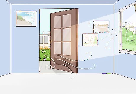 Open windows or use fans to increase the airflow in your home. Airflow through your homes helps move mildew spores around so they don’t settle on any surfaces. Open some windows around your home so there’s a comfortable breeze blowing through them. If you don’t feel a breeze after opening windows, use floor or ceiling fans to help move the air around. If it’s already humid outside, avoid opening your windows since you could let some of the moisture indoors. Open windows on the opposite side of your home if possible so the air can come in one way and out the other. That way, mildew spores blow out of your home rather than circulating around it.