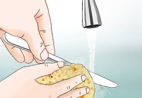 Wash silverware with warm water and mild soap immediately after using it. Don’t leave silverware in the sink with food residue since the acids could cause the silver to discolor. Wipe the silverware clean with a soft washcloth or sponge soaked in warm soapy water. After you wash the silverware, dry it immediately since moisture left on the surface can make tarnish develop faster. Don’t let silverware soak in water for extended periods of time since it could also cause tarnish to form.Warning: Avoid putting silverware in the dishwasher since the detergent is usually abrasive and doesn’t clean as well as washing it by hand.