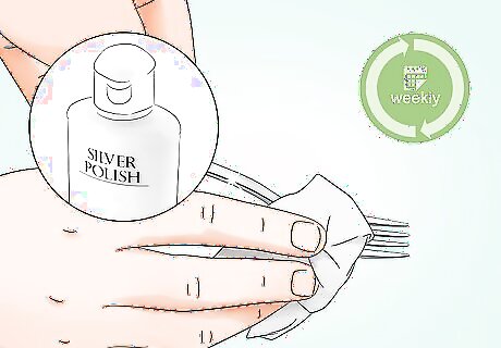 Polish your silverware weekly if you’re able to. While it can be time-consuming, polishing the silverware every week is the best way to ensure it stays clean. Use a polish that’s made for silver since other polishes could cause pitting or leave small scratches. Apply a pea-sized dab of the polish to a soft cleaning rag or cotton ball, and move the silverware back and forth to apply it. Once you polish the silverware, rinse it under cold water and dry it completely. You can buy silver polish from jewelry stores or online. If your silverware has intricate details on it, then use a soft-bristled toothbrush to work the polish into the hard-to-reach areas. You can also use toothpaste in place of silver polish if you want. Don’t use a colored gel toothpaste since it may leave residue on your utensils.