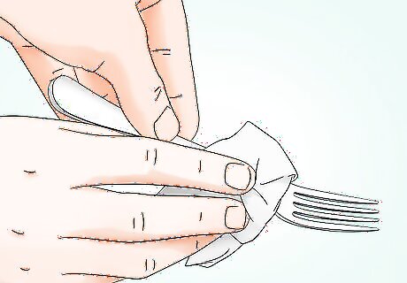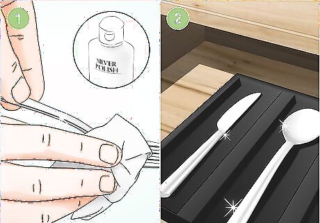 Polish your silverware before putting it away. Use polish that’s made specifically for silver or else you could damage your utensils. Dip a cotton ball or a cleaning rag into the polish and spread it over the piece of silverware. Work in back and forth strokes rather than in circles to prevent scratching. Once you polish the silverware, rinse it with water and dry it thoroughly to prevent tarnish. You can also use toothpaste if you don’t have any silver polish.
