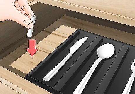 Keep white chalk in your silverware drawer to help absorb the moisture. White chalk reduces the amount of moisture and sulfur compounds that can cause tarnish. Wrap a few pieces of chalk in cheesecloth to prevent the dust from getting on other things in your silverware drawer. Replace the chalk once or twice per year to keep your silverware looking shiny. Store the chalk near the back of the drawer so it’s less likely to spill or get disturbed. Avoid using colored chalk since it may not be able to absorb as much moisture or sulfur. You can also use silica-gel beads to absorb the moisture in your drawer. You can buy silica beads online or from hobby stores.