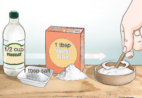 Combine white vinegar, baking soda, and salt in the bowl. Pour 1 tablespoon (17 g) of salt, 1 tablespoon (14.5 g) of baking soda, and ⁄2 cup (120 ml) of distilled white vinegar into the pan. Stir the mixture together until it forms a thick paste-like consistency. The vinegar and baking soda will form a reaction that helps lift the tarnish off the silver.