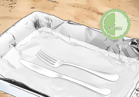 Submerge your tarnished silverware for 30 seconds. Place all of your silverware in the baking pan so each of the utensils touches the aluminum foil. Leave the silverware alone in the pan for at least 30 seconds, and watch for the tarnish to come off of the utensils. After that, use a pair of tongs to grab the silverware out of the pan so you can finish cleaning them. Don’t stack the silverware on top of itself or else the tarnish may not come off. You can do a few utensils at a time if you don’t have space for all of them in the pan.Tip: It may take heavily-tarnished silverware up to 3-5 minutes for it to get completely clean.