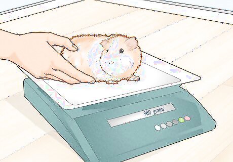 Weigh your guinea pig weekly. By weighing weekly, you are using one of the best tools available for monitoring your guinea pig's health. A dramatic weight drop could be a sign of an underlying health issue. On average, male guinea pigs weigh 900 to 1200 grams, and female guinea pigs weigh 700 to 900 grams. One ounce weight fluctuation is normal, however, 2-3 ounces is dangerous. Use kitchen scales to acquire an accurate estimate of your guinea pig's weight in grams.