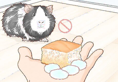 Limit the amount of sugary treats your guinea pig receives. Fruit can be fed 1-2 times a week as a treat. Commercial treats, such as pea flakes, should only be fed 1-2 times a day. Do not feed your guinea pigs treats that contain dairy, such as yoghurt drops, or treats that contain nuts or seeds.