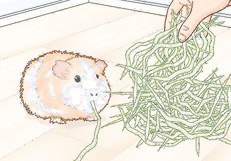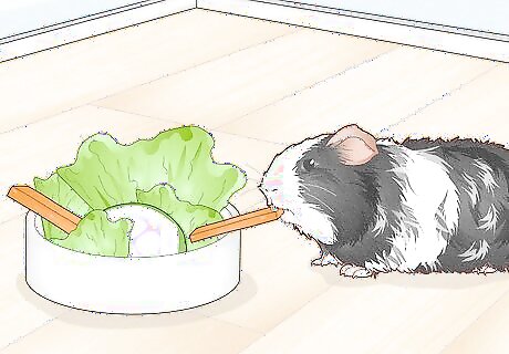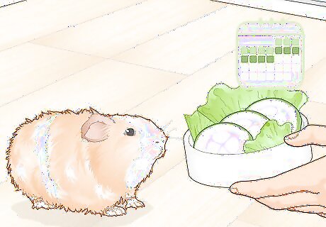 Feed a variety of fresh vegetables. Guinea pigs need one cup of green leafy vegetables a day, accounting to 15% of their whole diet. While hay is important for fibre, vegetables are necessary to provide nutrients and vitamins that your guinea pig cannot produce or receive from hay or pellets alone. Scurvy is a common cause of death for guinea pigs, which is generally a result of lack of vitamin C in their diet. Guinea pigs cannot produce this vitamin on their own. Red bell peppers (or capsicums) are a great source of vitamin C that can be fed on a daily basis. Guinea pigs can be fed different vegetables in a rotation of 2-4 times a day, which includes; kale, spinach, carrots, romaine lettuce, broccoli, tomatoes, celery, basil, parsley, coriander, cucumber, asparagus, and peas.