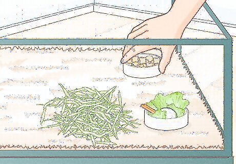 Set up a feeding station inside the cage. Guinea pigs frequently graze throughout the day to keep their digestive systems moving and teeth healthy. Some cages, such as Midwest cages, have a split section for feeding, to keep the area hygienic. Place a pile of hay on the floor. While it isn't advised to use hay racks, as they can be dangerous to guinea pigs, you can use a pan or litter tray to contain the hay. It's recommended to place large bundles of hay on the floor to encourage natural grazing. Place at least one medium-sized bowl on the ground to fit one cup of vegetables per guinea pig. You can choose to purchase two bowls if your guinea pigs are quite territorial. Place another smaller bowl on the ground to fit 1/8 cup of pellets for each guinea pig.