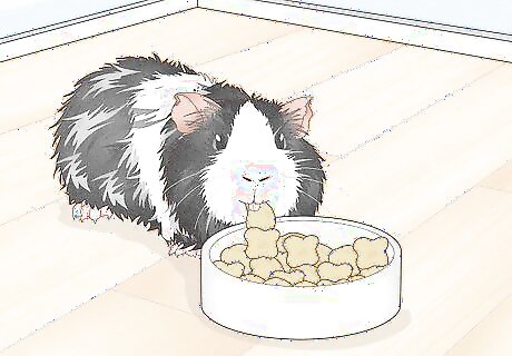 Supplement your guinea pigs diet with pellets. High-quality pellets that are fortified with vitamin C should account for 5% of your guinea pig's diet. 1/8 cup per guinea pig is suitable. Oxbow adult guinea pig pellets are a popular brand. Choose timothy hay-based pellets for adult guinea pigs. Alfalfa hay-based pellets should only be fed to guinea pigs under 6 months of age. Avoid rabbit pellets, and muesli or mixed brands. Purchase plain nuggets as colourful morsels of food can encourage selective feeding.