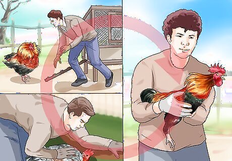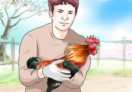 Dress for a beak and chicken-feet resistance. Wear leather gloves for protection, as well as long-sleeved shirts and pants when dealing with an aggressive rooster. Wear boots too, as roosters tend to be much shorter than humans and default towards fighting with their feet. Make sure your boots aren’t too floppy, as floppy boots may agitate roosters.
