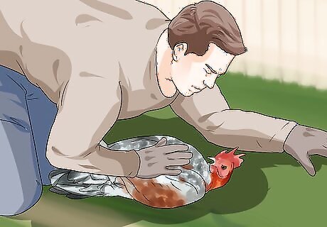 Take ownership of the coop. When a rooster attacks, you have a choice. You can run and forever be looked down upon by a multicolored bird with a jiggly throat, or you can send a message that it’s your yard, and it’s about time he acts right. Immediately leap into action as soon as the rooster become visibly agitated by scooping him up with gloved hands and sleeved arms.