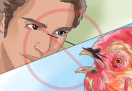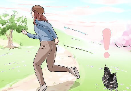 Recognize when he’s about to attack. Roosters will warn you that they’re coming for you by lowering their heads and initiating their war dance. Prior to this show of force, early warning signs include prolonged staring and running up on your from behind.