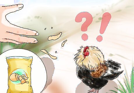 Distract him with snacks. A fabled rooster-defense tactic with proven effectiveness, tossing out a bit of feed will likely distract your rooster with remarkable consistency. Handfuls of grain may actually be all the protection you need. One of the benefits of feeding your rooster is that this shows him that you are not another rooster. While you may think they’ve already figured this out, they probably haven’t. Essentially, feeding your rooster will help them recognize that you’re just the giant, uninteresting creature that occasionally feeds them – and, more importantly, not a threat. Do this repeatedly to both distract them and make them more comfortable with your presence. They’ll likely start calling the hens out to come to enjoy the spoils too.