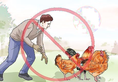 Move with haste. You shouldn't rely on avoiding your rooster as this is only a temporary solution to dealing with an aggressive animal. However, if you simply need to get in and out of the coop or chicken enclosure and don’t have time to do some rooster behavior-adjustment training, its fine to use some avoidance maneuvering. Move at a steady pace and give him a wide berth.