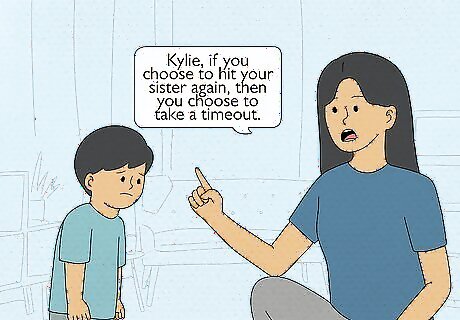Give the child a warning. If your child is misbehaving, start by giving him/her a warning. Make sure that the warning is clear and spoken in simple and concrete language that is easily understood. Emphasize choice and responsibility when giving consequences, such as, "Kylie, if you choose to hit your sister again, then you choose to take a timeout."