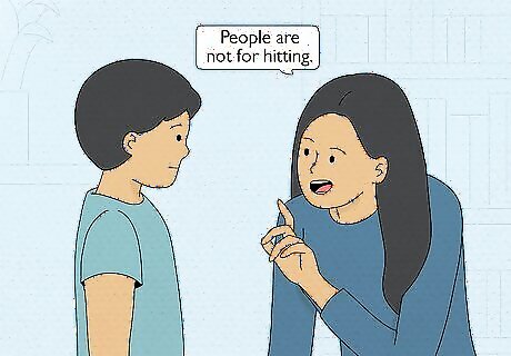 Instruct the child to stop. It is normal for toddlers to try to assert control over their environment. However, when their desire for autonomy results in aggression, destruction, or it jeopardizes their own safety, it's your job to intervene. Toddlers are still quite nonverbal and unable to process a lot of verbal exchange. Therefore, it's important to stick to very brief instructions. Typically the word no is overused and children are desensitized to it. In urgent situations such as a hot oven, use the word, "no," but in other situations is it better to offer a statement of fact that also gives the child a reason why the behavior is not correct. For example, instead of "no hitting people" parents should say "people are not for hitting." Or instead of "no throwing of toys" parents should say "toys are not for throwing."