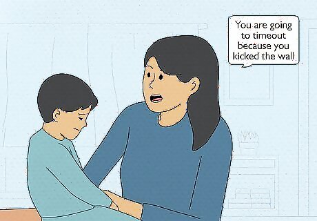 Tell your child to take a timeout. If the behavior continues, it is time to immediately implement the consequence. Always follow through with the timeout; this way you will avoid making empty threats. If you don't follow through, then your child will learn to not take you seriously. Briefly tell your child why he/she is being required to take a timeout. Do not spend a lot of time talking and avoid arguing altogether. A simple statement such as, “You are going to timeout because you kicked the wall” is sufficient. Physically guide the child to a timeout area if he/she refuses to go on him/her own. Escort him/her gently but firmly by the arm or pick him/her up and take him/her to the timeout spot. Remain calm when your child misbehaves. Remember, misbehavior on some level is developmentally appropriate for children. It is your responsibility to model appropriate behavior.