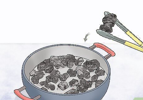 Take the coals out of the grill or fire pit with a pair of metal tongs. The charcoal will still be very hot when you take it out, so it's important to use steel grilling tongs to handle it. Wear heat-proof gloves for extra protection. This is a good way to cool down charcoal faster if you live in a fire-prone area or if you are using a public grill.