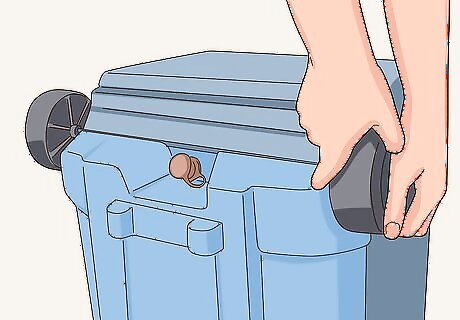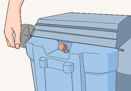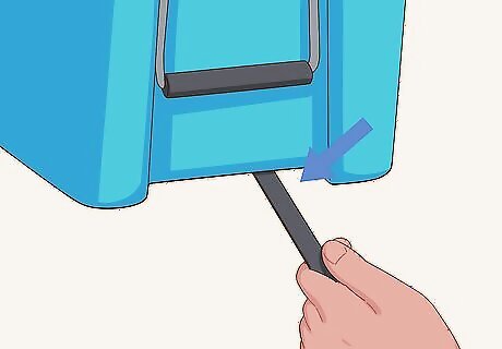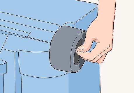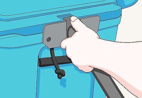 Pry out the stock axle. Set the cooler on its end so that the wheels are pointing up towards you. Hold the cooler steady with one hand and pull up on the old axle from beneath with the other. It should pop right out with enough force. Brace yourself against the body of the cooler with one knee to give yourself more leverage. Single axle all-terrain wheel systems are an easy way to upgrade older plastic coolers that already came equipped with wheels.