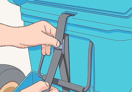 Strap the cooler down for added security. The simplest way to do this is to feed a strap or bungee cord underneath the bed, then pull both ends together at the top of the cooler. If the straps you're working with are particularly long, you may need to wrap them around more than once in order to hold the cooler in place. If you really want to make sure your cooler doesn't budge, consider using a pair of straps or cords. Ratchet straps can come in handy for locking down large coolers, as they can be tightened little by little until there's no slack remaining.
