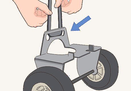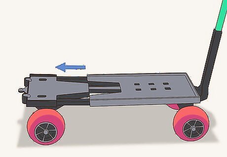 Extend the bed to accommodate larger coolers. Some newer carts feature configurable beds that are designed to hold objects up to 38 inches (97 cm) in size. When you need a little extra room, simply pinch the clips at the appropriate stop and pull the two halves of the wheel base apart until they're the desired length. This will make it possible to haul iceboxes of all shapes and sizes. Avoid loading your cart with a cooler that's bigger than the maximum dimensions of the wheel base.