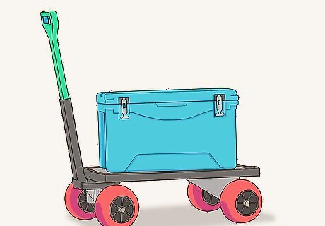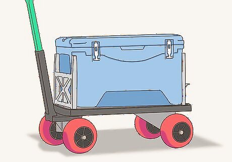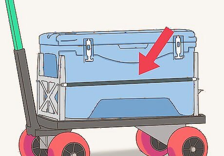 Set the cooler on the cart. Make sure the cooler is sitting flat and is properly centered on the bed. The edges of the cooler should line up with the lip of the bed, with no gaps or overlap. You may need to ask someone to help you lift the cooler if it's already full. Many flatbed carts are sturdy enough to support up to 400 pounds (180 kg), which means you can load up your most spacious cooler without worrying about how to transport it. If you're working with a more compact cooler, position it so that it sits closer to the handle side of the cart to make it easier to pull.