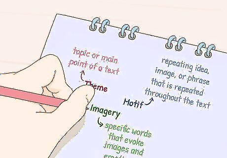 Read the passage carefully. Find a block of time when you’ll be able to devote your attention to reading. When you’re ready, take your time reading the chapter or poem that you’re trying to analyze. Practice close reading by paying special attention to major themes, and also note how you react to the text. Make a note if you find it interesting, confusing, etc. You should also shot down any unfamiliar words so you can look them up later. If the passage is pretty short, like a poem, you might decide to read it a few times before you start taking notes. If it’s pretty long, like a novel, you’re probably better off taking notes right from the start.