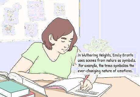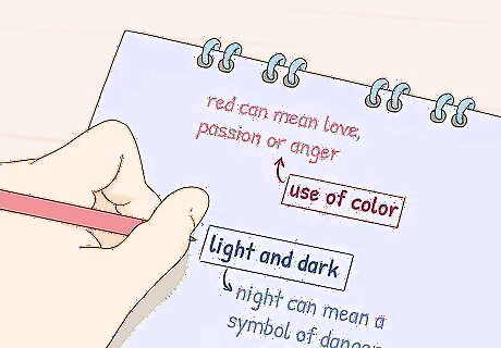 Note the characteristics of less-common symbols. If you think you’ve found a symbol that isn’t one of the super common ones, pay attention to the details the author includes about it. They might be trying to make symbolism a little less obvious or more open to interpretation. Pay attention to things like: Use of color. For example, red can mean love or passion, but it can also mean anger. Use of light and dark. If the author keeps mentioning that things are happening in the dark or at night, they might be using that as a symbol of danger, for instance. Use of unusual objects. Maybe the author keeps mentioning a book that is found in places where books aren’t common. Pay attention to how the book is described to try to figure out the symbolism.