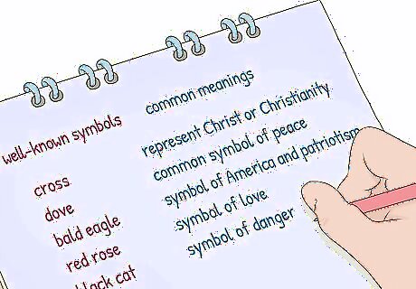 Make a list of common meanings for well-known symbols that appear. Many authors use common symbols so that they are easily recognized by the reader. Using your notes, put together a brief list of well-known symbols that you noticed when reading. Next to each one, write the possible meaning. Some examples of common symbols and their meanings are: A cross is often representative of Christ or Christianity. A dove is a common symbol of peace. A bald eagle is used as a symbol of America and patriotism. A red rose is a symbol of love. A black cat is a symbol of danger.