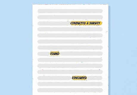 Highlight or underline key points of the article. Rather than reading word for word, use your understanding of the study (gleaned from the abstract or from other research) to hone in on buzzwords that indicate a particular statement is important. For example, words such as "found," "determined," or "concluded" typically signal the results of the study or the conclusions the authors of the article reached. In the methods section, highlight the word that describes the method used. It's usually a verb, such as "surveyed" or "tested." You might also see a similar phrase, such as "conducted a survey."