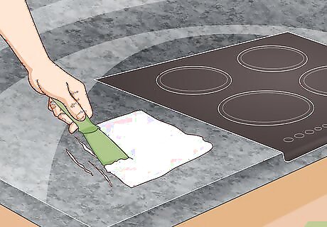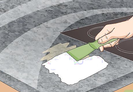 Scrape the poultice off with a plastic scraper. Remove the plastic wrap from your granite and put the blade of a plastic scraper next to the dried poultice. Keep the blade flat against the granite and push it through the poultice so it breaks apart. Continue scraping off the poultice until there isn’t anymore stuck on your countertops. Then sweep the residue into a dustpan so you can throw it away. If you have trouble using a plastic scraper on the poultice, try using a razor blade. Keep the blade flat against the granite’s surface so you don’t scratch it, and be careful so you don’t cut yourself.