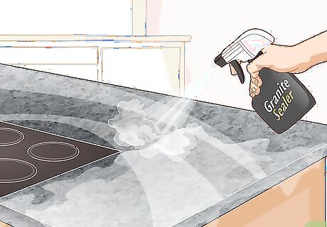 Spray the surface of the granite with a commercial sealant. Hold the spray bottle of sealant about 6 inches (15 cm) away and spray it generously onto your granite counters. Make sure you get an even layer of the sealant across the entire surface to ensure it seals properly. You can buy a bottle of granite or stone sealant from your local hardware store. Usually, 1 US quart (0.95 L) of sealant covers about 150–250 square feet (14–23 m) of granite. Open windows or turn on a vent fan in the room where you’re working since sealant can create harmful fumes. If it’s raining, avoid opening windows next to your granite since water could get on it and ruin the seal.