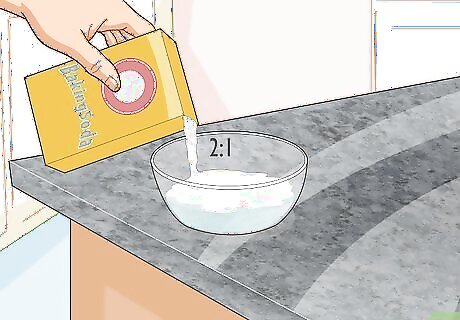 Create a poultice paste from 2 parts baking soda and 1 part water. Pour the baking soda and water in a small bowl so you have enough to cover the stain. Mix them together with a plastic spatula until they’re thoroughly combined into a paste with a similar consistency to peanut butter. Add more baking soda if it feels too runny, or pour in water if it’s too thick to work with. You can also buy stain remover powder made for granite from a hardware store. Mix it with water so it has a similar consistency. Avoid using vinegar or hydrogen peroxide for your poultice since it can discolor or damage your granite.Tip: Test a coin-sized amount of the poultice in an inconspicuous spot on the granite, such as an area that’s normally covered by an appliance, to see if it affects the color.