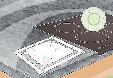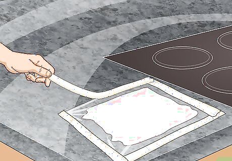 Cover the poultice with plastic wrap and tape down the edges. Rip off a piece of plastic wrap that extends past the poultice’s edges by about 1–2 inches (2.5–5.1 cm). Press the wrap flat against the granite and poultice so it makes firm contact with them. Use masking tape around the edges of the plastic wrap to hold it in place so it doesn’t come off while you’re treating your stain. Avoid using duct tape since it can leave sticky residue on your countertops. You don’t have to tape the edges down, but the plastic wrap may move or blow away and make the poultice dry too quickly and make it less effective. If you need to cover oily sections that are wider than the plastic wrap, overlap the pieces by 1 inch (2.5 cm) and tape them together.