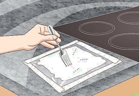 Poke holes in the plastic wrap to allow airflow. Use a fork or safety pin to poke holes every 1–2 inches (2.5–5.1 cm) in the plastic wrap. Keep the holes evenly spaced so air can flow around the poultice so it’s able to slowly dry out and draw the stain out. Be careful not to scratch the granite with the pin or fork.