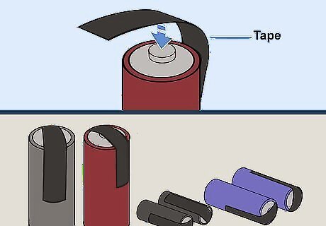 Bag or tape the tops of non-alkaline batteries before recycling. The batteries may still have a bit of charge left, so it’s important to separate the terminals, where the charge comes out of. To do this, you can either place each battery in a separate plastic bag or place a piece of clear tape over the terminal, or the small bump, on the top of the battery. If 2 battery ends touch, the tape will help prevent sparking and lower fire risk. Do not use opaque tape on the battery ends. Do not bag or tape any single-use alkaline batteries.