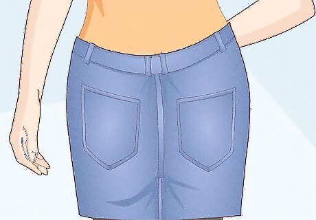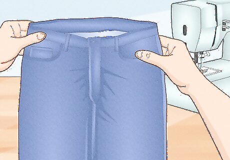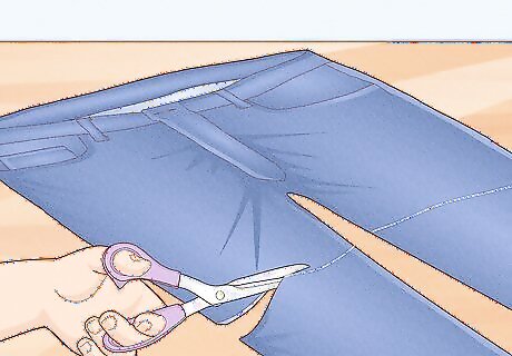 Make a skirt. If you have some basic sewing knowledge, it's not hard to turn a set of jeans into a skirt or dress. See our main article on this subject for step-by-step instructions. To do this: Open the inside seam of both legs. Stitch the front part of both legs together to form a new front seam for your skirt. Stitch a large piece of fabric between the back part of each leg to complete the skirt. Trim the skirt to your desired length.