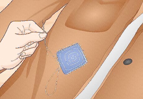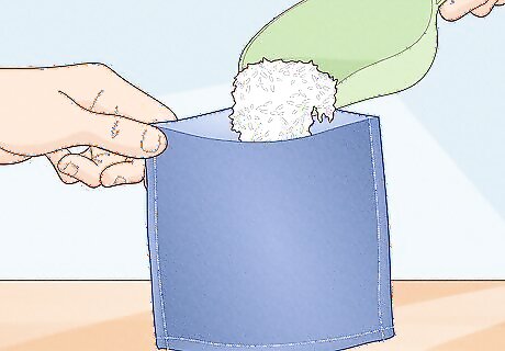 Make a heating pad. This easy project is a must for treating back pain or sore muscles. Cut two identical squares of fabric from the jeans (see the trick above for cutting sets of rags). Stitch up three sides tight, leaving the fourth open. Scoop uncooked rice into the opening. Stitch the final side shut. Microwave the pad in 20-second increments until it is warm, then hold it against your sore spots. Use a large tube-shaped pad instead of a square to make a neck pillow that's great for painful kinks.