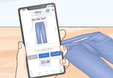 Unload the jeans online. This is a great option if you're looking to make a little extra cash. Sites like Ebay and Craigslist offer convenient options for selling your jeans. You're not likely to get very much money for used jeans (unless they're designer), but something is better than nothing. Check other ads for jeans in your area before you price yours. You want to pick a competitive price to stand a good chance of selling your jeans. Be sure to clearly list the size, maker, and style of the jeans in your ad. Note any areas of wear. Being honest is important for your reputation as a seller.