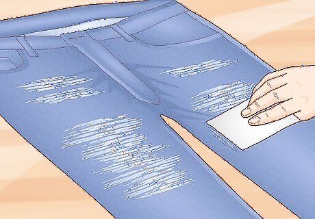 Distress your jeans for a "shredded" look. Have a pair of jeans that's starting to look worn-out? Make a fashion statement by wearing them out more. Cut them, shred them, crush them, or otherwise beat them up to make your own "distressed" denim. See our guide to distressing jeans for lots of specific ideas. One beginner-friendly option is to use a cheese grater or a square of sandpaper to wear out your jeans' knees. Shred until white, worn areas begin to develop or you have a set of ragged holes — whichever you prefer. This is also a good opportunity to get rid of stains. Shred the stained area until the stain is gone.