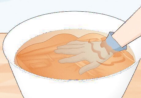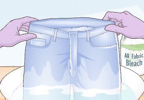 Dye the jeans. For most people, denim is synonymous with the color blue. However, there's no reason this has to be the case. With dyes, you can turn old blue jeans into colorful new additions to your wardrobe. Try this easy dip-dying method below (or see our main jean-dying article): Soak the jeans in bleach until they are as white as possible. Rinse with water to neutralize the bleach. Let the jeans dry. While you wait, mix fabric dye according to the instructions. Dip the dry bleached jeans in the fabric dye while wearing leather gloves. Stir the mixture so that they are evenly coated. Dip several more times, wringing out the moisture between dips. Rinse in water with a little detergent to set the dye. Let the jeans dry.