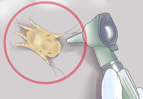 Know how difficult it is to spot the mites. Ear mites are tiny parasites, measuring less than .5 millimetres (0.020 in), and only just visible to naked eye. Mites are also photophobic (afraid of light) and tend to live deep within the ear canal, so you need a special instrument, called an auroscope, to see them. Alternatively, your vet may smear a sample of wax from the affected ear onto a slide and examine this under the microscope to look for adult mites, larvae or eggs.
