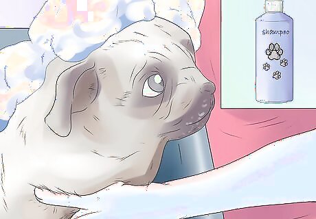 Bathe your pup with an insecticidal shampoo for added protection. When a dog scratches his ear, he may transfer ear mites to his paw. When an active infection is present it is helpful to bathe the dog weekly with an insecticidal shampoo (such as Seleen) to decrease coat contamination, which can act as a reservoir for reinfection. You may find one or more of the following wikiHows helpful: How to Give a Small Dog a Bath How to Give a Large Dog a Bath How to Bathe a Dog and Keep It Calm How to Bathe a Puppy for the First Time