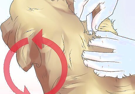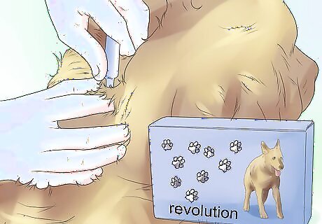 Apply the recommended amount of medication. The placement of the medication will depend on the size of the dog and the volume of product to be applied. However, spot-on treatment will be often be applied to either the back of your dog's neck or between its shoulder blades. To apply spot-on treatment to one of the these locations: Ensure you're using the right amount of the ingredient. As stated above, different concentrations of the active ingredient are necessary, depending on the size of the dog, so you should be absolutely positive that you are using the recommended pipette strength for your pet’s weight. Part the hair and place the tip of the tube onto a visible area of skin. Squeeze the tube 3 or 4 times until the container has been emptied. Avoid petting the area for a few hours after application to prevent the product from being spread to your hands.