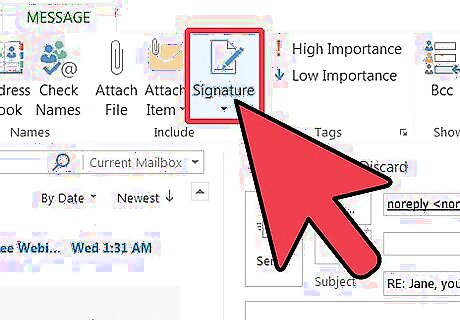 Choose an email in your inbox and click “Reply” at the top of the email screen. You should now see the E-mail Signature tab amongst the options.