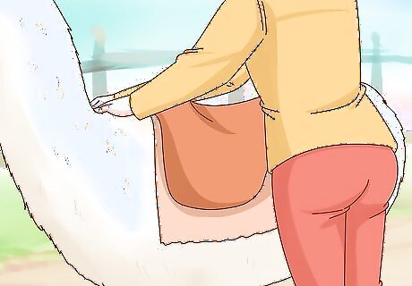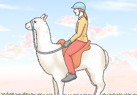 Put your hands at the withers (where the neck meets the body). Hoist yourself up onto the animal. Swing your leg over the top of the llama to settle onto the pack saddle. If you are too short to get onto the llama, try using a footstool for leverage. Make sure you are secure in the saddle. If you aren't comfortable, adjust your position.