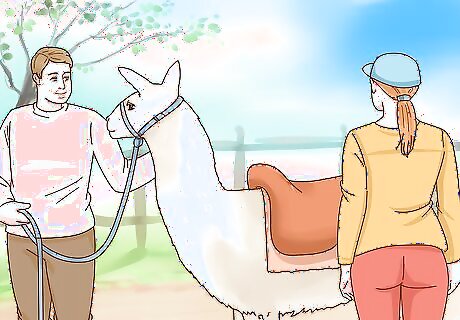 Have someone else soothe the llama and hold the reins. You can now get on the llama. It is important that the llama is calm before you get on the saddle. If a llama becomes alarmed and fidgets while you are getting on, you can get injured. Having someone else settle the llama while you are mounting the pack saddle can help.