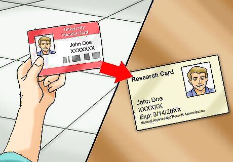 Get a Researcher Identification Card to view original records. Bring official photo identification (such as a driver's license, passport, or school/work ID) and proof of address to get a Researcher Identification Card. The card is valid for one year. You'll also have to fill out a brief form providing your name, contact information, and a description or summary of your research topic.