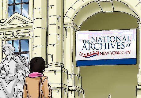 Go to the National Archives at New York City. The National Archives at New York City is located at One Bowling Green, Room 328, New York, NY 10004. The Archives are open from 10:00 a.m. to 5:00 p.m. Monday through Friday, excluding federal holidays. The National Archives is located in a high-security federal building, so be prepared to go through a security screening and show a government-issued photo ID to enter. When you arrive, sign in on the registration sheet and indicate what kind of materials you plan to use during your visit.